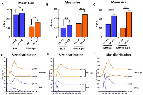 Dynamic light scattering analysis at pH 7.4 and pH 4.0. (A–C) Mean diameter and (D–F) size distribution of biological and hybrid NPs. Each type of NPs was analyzed at least 5 times. ** p < 0.01, *** p < 0.001, **** p < 0.0001, ns—not significant.