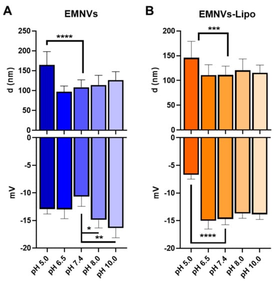 Average size and Z-potential of EMNVs/EMNVs-Lipo at different pH. (A) Mean size and ζ-potential of EMNVs, (B) Mean size and ζ-potential of EMNVs-Lipo. Each type of NPs was analyzed by NTA (for mean size measurements) and at least 5 times by DLS (for ζ-potential measurements). * p < 0.05, ** p < 0.01, *** p < 0.001, **** p < 0.0001.