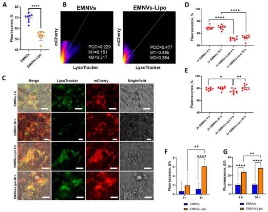Endolysosomal escape of EMNVs and hybrid EMNVs-Lipo. HepG2 cells were stained with LysoTracker Green DND26 (green) and treated with mCherry-loaded EMNVs or EMNVs-Lipo (red). Efficiency of endolysosomal escape was measured as the percentage of the mCherry signal that does not colocalize with the green signal. (A) Percentage of mCherry-loaded NPs escaping the endolysosomal compartment presented as mean values for 8 images of at least 600 cells. (B) Colocalization analysis of mCherry/LysoTracker with EMNVs and EMNVs-Lipo. (C) Representative fluorescence images of HepG2 cells. Scalebar: 20 μm. Percentage of mCherry-loaded EMNVs or EMNVs-Lipo escaping the endolysosomal compartment at 6 h and 36 h after NPs treatment adding (D) 1× or (E) 2× concentration of NPs. (F) Change in endosomal escape of 1× or 2× concentration of NPs presented as the difference in cytoplasmic mCherry at 36 vs. 6 h. (G) Change in endosomal escape at 6 h and 36 h after adding NPs presented as a difference in cytoplasmic mCherry at 1× or 2× concentrations. * p < 0.05, ** p < 0.01, **** p < 0.0001.