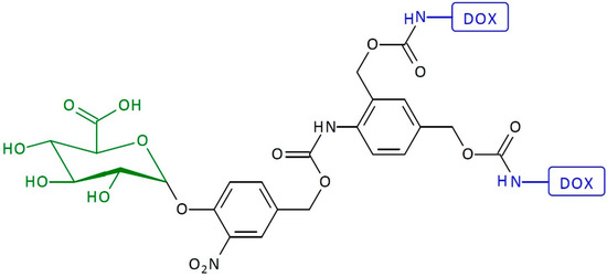 An example of an enzyme-activated SIDendr-ac-DDSs is a system containing a trigger substrate activated by β-glucuronidase and two DOX molecules (Figure 7) [21]. Initially, due to enzymatic activation, the hydrolysis of the dendrimer occurs. The sugar molecule splits off from the dendrimer. Next, the processes of 1,8-elimination and decarboxylation occur, releasing the drug molecule from the dendrimer. It was found that the dendritic system, upon β-glucuronidase activation, causes two times more toxicity toward H661 lung cancer cells than its monomeric counterpart. The advantage of this system is the relatively simple preparation method. Moreover, it is characterized by high toxicity towards cancer cells.