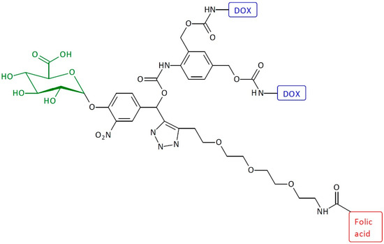A similar system was additionally conjugated with folic acid (FAc) (Figure 8) [22]. Grinda and coworkers showed a trigger with a lysosomal β-galactosidase-activated substrate incorporating FAc as a guide moiety. The obtained system comprises the following five units: a targeting ligand, an enzymatic trigger, a self-immolative spacer, and two active drugs articulated around a chemical amplifier. Two molecules of DOX are released after β-galactosidase activation and subsequent multiple elimination reactions. Because of the presence of the FAc, the SIDendr-ac-DDSs recognize a population of cells that autonomously express the folate receptor. The most significant advantage of the obtained system is the presence of a group in the structure that targets cancer cells. This significantly increases the pharmacological properties of the SIDendr-ac-DDS.