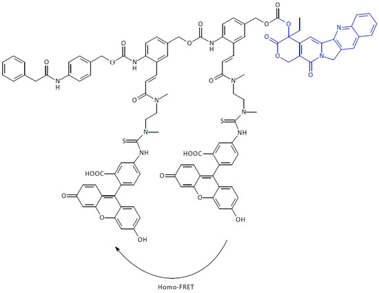SIDendr-ac-DDSs were also developed for ‘theranostics,’ a combination of therapy and diagnostics. In the system, a turn-ON fluorescent diagnostic signal accompanies the disassembly of the prodrug and enables the monitoring of the active drug release. The signal is generated through the fragmentation of a dimeric self-immolative linker attached to a pair of FRET dyes. SIDendr-ac-DDS is one example of this, which relies on self-immolative dendritic units containing two molecules of dye located in close spatial proximity, thus extinguishing their fluorescence (Figure 9) [23]. SIDendr-ac-DDS is equipped with phenylacetamide as a penicillin-G-amidase (PGA) substrate and CAMPT coupled via a self-immolative bridge. The linker comprises two aniline adapter units attached to a pair of fluorescein dyes. Upon activation by the trigger group, the PGA exposes the aniline unit, resulting in sequential 1,6-eliminations that increase the distance between the released CAMPT and the fluorescent dyes. The obtained results demonstrate that an increase in the emitted fluorescence signal is observed after the specific activation of the prodrug. The most significant advantage of the obtained system is the fluorescent agent presence in the structure that allows the combination of oncology therapy and diagnostics. Moreover, the developed SIDendr-ac-DDSs were characterized by highly controlled drug release kinetics. The disadvantages include the relatively complicated SIDendr-ac-DDS synthesis method.