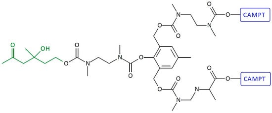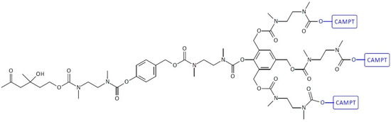 A dendritic molecular system with three CAMPT molecules has been synthesized by Haba et al. (Figure 13) [26]. The authors synthesized the trimeric prodrug system in which three molecules of the anti-cancer drug CAMP (pro-CAMP) were linked through a retro-aldol, retro-Michael trigger to a substrate for the catalytic antibody 38C2. The trigger activation by CA 38C2 resulted in the re-leasing of three CAMPT molecules via a cyclization step and the triple elimination of quinone methide. The single-triggered homotrimeric SIDendr-ac-DDSs were stronger than the corresponding monomeric SIDendr-ac-DDSs mediated by the catalytic antibody 38C2. It was found that prodrugs in the presence of catalytic antibody 38C2 slowed down the cell proliferation for the following three different cell lines: the human T-lineage acute lymphoblastic leukemia (ALL) cell line MOLT-3, the human erythroleukemia cell line HEL, and the human acute myeloid leukemia (AML) cell line HL-60. The most significant advantage of the synthesized system is the enhanced cytotoxic effect on cancer cells compared to monomeric SIDendr-ac-DDSs.
