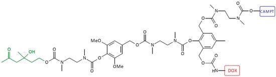 Heterodimeric first-generation SIDendr-ac-DDSs consisting of CAMPT and DOX as end units were also prepared (Figure 11) [24]. The IC50 values of the dimeric prodrugs were also about 200-fold less toxic than the free CAMP (like the monomeric prodrugs). However, the dimeric prodrug was about four times more active upon the addition of 38C2 in comparison to the monomeric prodrug. Moreover, a synergetic cytotoxic effect was noticed for such heterodimeric systems after bioactivation by CA 38C2. The aforementioned biological synergistic effect is an undoubted advantage of the developed systems. An additional positive is the simple method of synthesizing these SIDendr-ac-DDSs.