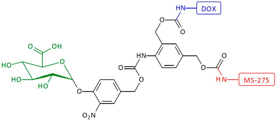 Another example of heterodimeric first-generation SIDendr-ac-DDSs is a dendritic platform that works by 1,6- and 1,4-eliminations with a platform that includes the N,N′-dimethylethylenediamine moiety (Figure 12) [25]. The single-triggered SIDendr-ac-DDS consists of the β-glucuronidase enzymatic substrate, DOX, and histone deacetylase inhibitor (MS-275 units). The heterodimeric prodrug includes a nitrobenzylphenoxy carbamate linker between the glucuronide trigger and the amplifier unit. The enzyme substrate is located at a substantial distance from the two drug molecules, allowing easy recognition by β-glucuronidase. The enzyme-catalyzed cleavage of the prodrug results in the release of phenol intermediate, which induces the release of aniline through a 1,6-elimination process. Once turned on, the amplifier first causes the expulsion of DOX via a 1,4-elimination, followed by spontaneous decarboxylation. Adding water to ortho-azaquinone methide generates aniline, thereby permitting the release of MS-275. The most significant advantage of the developed systems is the incorporation of MS-275 into the SIDendr structure and their controlled release. As is known, histone deacetylase inhibitors are considered as new-generation anti-cancer drugs that induce increased histone acetylation. These compounds modulate the structure of chromatin, which leads to changes in the expression of many genes that influence signaling pathways, the inhibition of the cell cycle and angiogenesis, or the induction of apoptosis in cancer cells. Currently, many types of histone deacetylase inhibitors are at the same stage of clinical trials as monotherapy, or in combination with other cytostatics.