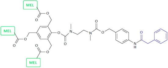 Another example of a homotrimeric system is SIDendr-ac-DDSs with melphalan (MEL) tail units and a PGA-activated trigger (Figure 14) [27]. It was discovered that the trimeric prodrug system could offer outstanding benefits in the inhibition of tumor growth compared to common monomeric prodrugs (human T-lineage acute lymphoblastic leukemia MOLT-3 cells), mainly if the target or secreted enzyme (PGA) is present in relatively small amounts in the tumor tissue. It was found that MEL was released from the obtained systems with relatively high control. The main advantages of the synthesized systems are the enhanced cytotoxic effect on cancer cells compared to monomeric systems and the high control over the release of the anti-cancer drug from this SIDendr-ac-DDS.