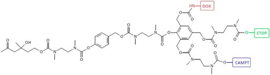 Structure of heterotrimeric first-generation self-immolative domino-dendrimer-based camptothecin, doxorubicin, and etoposide delivery systems.
