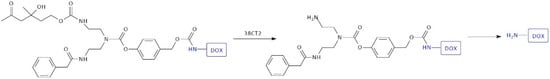 Other examples of homodimeric first-generation SIDendr-ac-DDSs are CAMPT- or DOX-containing systems (Figure 10) [24]. These anti-cancer medicine molecules were implanted with the retro-aldol, retro-Michael substrate of catalytic antibody 38C2 (CA 38C2) as a trigger. The retro-aldol, retro-Michael substrate of antibody 38C2 was attached to the adaptor platform through a self-immolative linker with adequate length to avoid steric hindrances accompanying the complex structure of the doxorubicin (DOX) molecule. The dendritic prodrug bioactivations were evaluated in a cell-growth inhibition assay with the Molt-3 leukemia cell line in the presence and the absence of mouse monoclonal antibody 38C2. The IC50 values of the monomeric prodrugs were about 200-fold less toxic than the free CPT. The activity of the monomeric prodrug had shifted to a 10-fold difference from that of the free CPT (upon the addition of 38C2). The main advantage of the obtained systems is the relatively simple preparation method and their very high activity towards cancer cells and low toxicity towards normal cells.