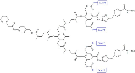 SIDendr-ac-DDSs with polymer unit fragments have also been created. The second-generation SIDendr-ac-DDSs have not been as promising as the first-generation ones, due to the hydrophobic-structure-caused aggregation, poor cleavage efficiency, and steric hindrance at the focal sites of the dendron. The dendrimer was grafted with poly(ethylene glycol) (PEG) to address the issue. The synthesis of the dendritic molecule was obtained in a number of steps. First, 4-hydroxybenzoic acid was coupled with propargylamine to produce amide, which was further reacted with formaldehyde. The obtained product was selectively protected with two equivalents of tert-butyl-dimethylsilyl chloride to generate a phenol derivative, which was then activated with p-nitrophenyl chloroformate to produce a carbonate derivative. The reaction of mono-Boc-N,N′-dimethylethylenediamine with the carbonate derivative afforded carbamate, which was stirred with amberlist in methanol to generate a compound with the blocking groups removed. Then, post-reactions were carried out with 4-nitrophenyl isocyanate, trifluoroacetic acid, and p-nitrophenyl chloroformate. The dendric compound was obtained. Finally, the dendritic molecule was conjugated with 2 equiv of PEG 400-azide via the copper-catalyzed click reaction to produce SIDendr-ac-DDSs with two PEG-5000 tails conjugated with four CAMPT molecules. The tails of the PEG molecules lowered the hydrophobic properties of the dendritic system and increased its aqueous solubility, thereby preventing aggregation. Gopin et al. obtained SIDendr-ac-DDSs with two PEG-5000 tails conjugated with four CAMPT molecules and a single-triggering substrate activated by PGA (Figure 18) [29]. It was found that PGA effectively activates the dendritic prodrugs, and its toxicity increased significantly in the cell-growth inhibition assays of three cancerous cell lines (the human T-lineage acute lymphoblastic leukemia cell line MOLT-3, the human leukemia T cell line JURKAT, and the human kidney embryonic HEK-293 cell line). It was also found that CAMPT was released from the dendrimer in the presence of PGA in a highly controlled manner over approximately 180 h. The main advantages of the obtained systems include the highly controlled release of the anti-cancer drug and a high cytotoxic effect on pathological cells. An undoubted disadvantage is the multi-step and complicated method of synthesizing this type of SIDendr-ac-DDS.