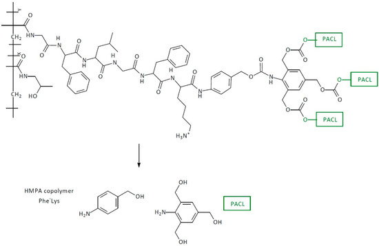 For the first time, the first-generation self-immolative dendrimer-based anti-cancer drug delivery systems (SIDendr-ac-DDSs) were obtained by de Groot et al. [20]. The dendritic molecular system was vinyl-benzylic moieties that could release terminal units via double 1,8-elimination. The nitro group was used to mask aniline at the focal point in its oxidized form. Two PACL molecules were conjugated to the rim of the SIDendr-ac-DDSs (Figure 6). The reduction of the nitro group to the amino group (with Zn catalyst, acetic acid conditions) launches a cascade of fragmentation via double 1,8-elimination, followed by decarboxylation reactions. All of those processes lead to the release of the terminal drug molecules from the dendrimer’s end unit. The undoubted advantage of the developed system is its straightforward structure and chemical activation in the presence of a non-toxic metal—zinc.