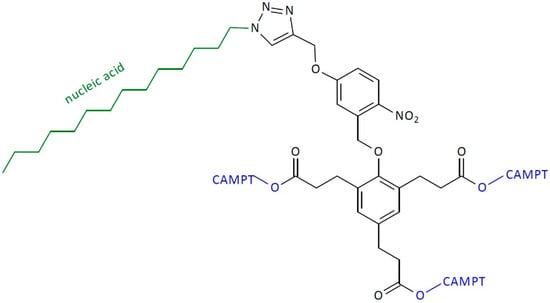 An exciting example of this is the use of nucleic acid to obtain SIDendr-ac-DDSs (Figure 20) [31]. Tan and coworkers synthesized the UV-responsive SIDendr-ac-DDSs built on a phenol dendric platform linked through carbonate bonds to three CAMPT molecules at the end sites. The DNA was conjugated to the dendrimer molecule using the “click reaction” method. The coupling process of the dendric compound and azide-modified DNA was carried out in the presence of CuBr and tris(benzyltriazolylmethyl)amine. The amphiphilic prodrug was prepared by conjugating the SIDendr-ac-DDSs to a DNA strand. It was observed that, in an aqueous environment, the SIDendr-ac-DDSs could self-organize into nanostructures. The nanostructures were rapidly taken into cells, and the attached DNA was resistant to nuclease cleavage. The effect of UV irradiation at 365 nm caused the separation of the nucleic acid shell. Thus, the exposition of phenolate of the self-immolative dendron and the subsequent triple elimination released the CAMPT. It was found that the DNA–CAMP exhibited much reduced toxicity compared with the free CPT in the absence of UV light. Furthermore, adding UV irradiation did not increase the cytotoxicity of the free CAMP. Moreover, the cell-killing efficacy of the DNA−CAMP conjugate was significantly amplified by the UV treatment [31]. The most important advantage of the obtained SIDendr-ac-DDSs is their easy penetration into cancer cells and the highly controlled system activation. A certain disadvantage is the relatively complicated synthesis method.