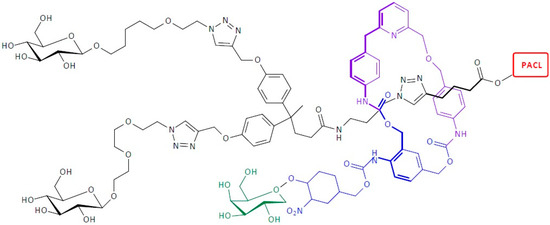 Supramolecular SIDendr based on [2]-rotaxane were also obtained. A PACL-prodrug, with an esterase-cleavable linker, is mechanically linked to the macrocyclic ring (Figure 24) [33,37]. The crucial step in the synthesis of the DDS relies on constructing the interlocked architecture via the Cu(I)-catalyzed azidealkyne 1,3-cycloaddition active-metal template strategy. The coordination of Cu(I) to the endotopic pyridine-containing macrocycle allows the azide and alkyne to bind to the metal catalyst in such a way that the formation of the triazole thread occurs predominantly within the cavity of the macrocycle, leading to the rotaxane architecture. The galactosylated ring was prepared from biscarbonate and dianiline derivatives. The macrocycle was treated with azide, alkyne, and Cu(CH3CN)4PF6 for 45 h at room temperature in CH2Cl2/CH3OH (87/13) to afford [2]-rotaxane. β-galactosidase triggers a self-immolative linker, which is built in the macrocyclic ring. The initiation of the first phenol-based linker takes place upon exposure to the enzyme via 1,6-elimination. In the next step, the 2,4-substituted aniline undergoes 1,6- or 1,4-elimination to fragment the locking ring, exposing the prodrug cleavable bond. The antiproliferative activity of the DDSs on HUVEC normal cells was evaluated. Compared to the cancer cells tested in this study, the DDS was less toxic for the HUVEC cells, with only a 20% reduction in cell viability at the highest tested dose [33,37]. The most important advantage of the developed system is the lack of toxicity towards normal cells, which allows for the selective destruction of cancer cells. A significant disadvantage is the very complicated and multi-step synthesis of this SIDendr-ac-DDS.