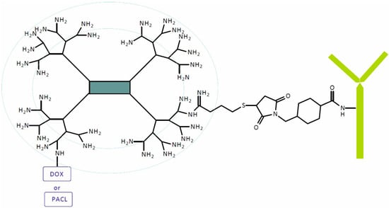 Two SIDendr trastuzumab (TMAB) and DOX or PACL specifically targeted to cells that overexpressed human epidermal growth factor receptor 2 (HER-2) were obtained by Marcinkowska and coworkers (Figure 26). Drugs and PAMAM (G4) were conjugated in the presence N-(3-dimethylaminopropyl)-N′-ethylcarbodiimide hydrochloride (EDC). The PAMAM–drug–TMAB conjugate was obtained in the reaction of derivatized TMAB and thiolated PAMAM–drug conjugate at a 1:12 molar ratio [41].