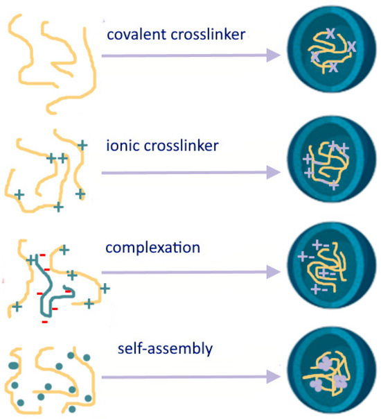 Polysaccharide nanoformulations have gained significant attention in drug delivery due to their biocompatibility, biodegradability, and versatility. These nanoformulations involve incorporating drugs or therapeutic agents into polysaccharide-based nanocarriers to enhance drug stability, solubility, and targeted delivery to specific tissues or cells. Various polysaccharides, already mentioned above, such as chitosan, alginate, hyaluronic acid, cellulose, dextran, and others, have been utilized in the development of nanoformulations for drug delivery purposes and with antioxidative properties [97,98,99,100,101]. In their detailed review, Mizrahy and Peer thoroughly examined the primary mechanisms generally involved in the synthesis of polysaccharide nanoparticles [102]. These mechanisms include chemical (covalent) crosslinking, physical (ionic) crosslinking, polyelectrolyte-complexation, and self-assembly (Figure 4).