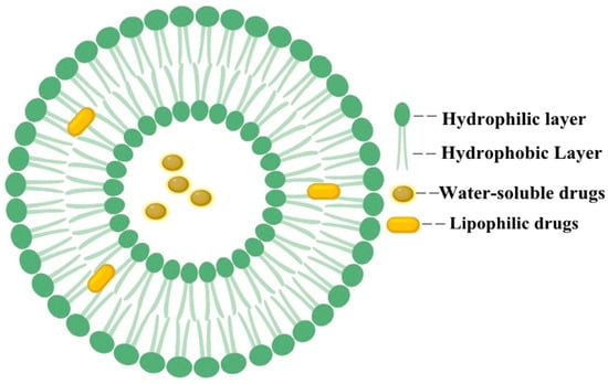 Liposomes, characterized by their ordered bilayers of lipids forming enclosed vesicles, possess a hydrophobic shell and a hydrophilic core, with a particle size ranging from 20 to 1000 nm [6,7]. Owing to their distinctive composition and structure, liposomes exhibit excellent biocompatibility and can be metabolized normally. Consequently, they can enhance drug solubility and mitigate drug toxicity [8,9,10]. Liposomes are capable of encapsulating both hydrophilic and hydrophobic drugs [11], thereby protecting them from degradation and preventing drug accumulation in other tissues and organs [12] (Figure 2). The development of liposome drug delivery systems grounded in nanotechnology has taken nearly half a century to be integrated into clinical practice; this advancement has catalyzed a quantum leap in the development of anti-tumor, anti-bacterial infection drugs and vaccines. For instance, in the case of the anticancer agent resveratrol, the utilization of solid lipid nanoparticles for its delivery led to a significantly increased brain concentration of resveratrol in Wistar rats compared to free resveratrol, indicating high penetration into brain tumors and minimal systemic toxicity [13].