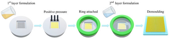 Silicone rings that can be attached to the surface of MAP moulds to prevent formulation spilling during centrifugation were fabricated as previously described [26]. A master template for the silicone ring was first designed using Tinkercad (Autodesk, Helsinki, Finland) and then 3D-printed using acrylonitrile butadiene styrene (ABS) filaments via an Ultimaker® 3 3D printer (Ultimaker B.V., Geldermalsen, The Netherlands). The Xiameter® silicone base and its corresponding curing agent were mixed at a ratio of 10:1, then blended until homogeneous using a SpeedmixerTM (Synergy Devices Ltd., London, UK) at 3000 rpm for 15 s. The resulting formulation was then poured into the 3D-printed master template and left at ambient temperature overnight to ensure complete curing, as shown in Figure 1.