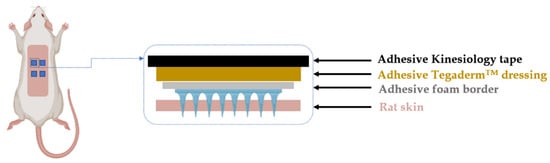 The hair on the rat skin was carefully shaved using an electric razor and hair removal cream (5 min) 24 h before the MAP application to minimize the influence of relatively high hair density on MAP insertion. For the dissolving MAPs cohort, each rat received four dissolving MAPs with a specific ‘wrapping’ to prevent rats from displacing and consuming the applied MAPs, as illustrated in Figure 3. Briefly, an adhesive foam border layer, an adhesive TegadermTM (3M, Bracknell, UK) dressing layer, and adhesive kinesiology tape were placed on top of the inserted MAPs to maintain their position. The dose given to the rats by the dissolving MAPs was determined based on ex vivo bioavailability and matched with the control cohort. Table 1 lists the experimental design of this in vivo pharmacokinetic study.