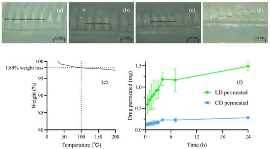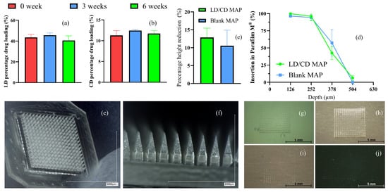 The physical properties of the formulated dissolving MAPs were characterised in terms of their height reduction against pressure and insertion depth in a previously developed Parafilm® M insertion model [28]. The needle length after compression and holes created in each Parafilm M® layer were visually examined with a Leica EZ4D digital microscope. Generally, needles with a height reduction less than 20% are considered mechanically strong microneedles [45]. As illustrated in Figure 4e, the formulated LD/CD MAPs had a height reduction of 12.84 ± 2.34%, and the blank MAPs made from the same polymeric composition had a height reduction of 10.55 ± 3.88% (n = 5). The difference between the two investigated formulations is considered not significant (p > 0.05), presenting an acceptable needle strength against compression.