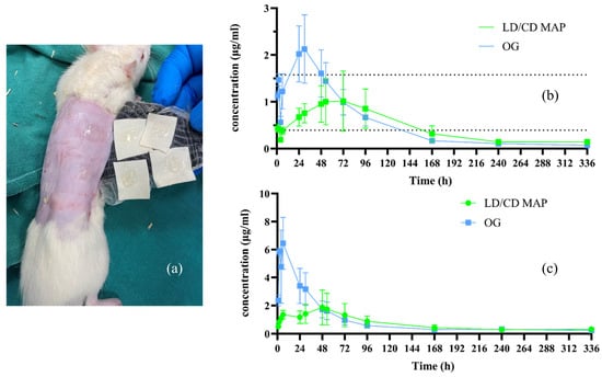 (a) Representative images of the backs of rats upon LD/CD MAP removal. In vivo pharmacokinetic profiles of (b) LD and (c) CD (means ± S.D., n = 3 for 1, 2, 4, and 6 h, n = 6 for the other sampling points). The dotted lines show the therapeutic window of LD [49].