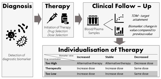 Biomarkers have an important role in the diagnosis of infectious diseases as they can be readily tested (usually using blood samples) and can be quantified immediately (within a few hours). Unlike traditional methods of diagnosis, like culture, biomarkers can therefore be used to rapidly diagnose diseases and initiate therapy sooner, which is critical in immunocompromised patients. Ensuring patients are on the correct drug at the right dose as quickly as possible is just as important as early detection of disease. While biomarkers have traditionally been used in diagnosis, they also have an emerging role in monitoring antimicrobial treatment responses. It is logical to interpret PD biomarker concentrations alongside TDM, which is often utilised to assess drug exposure in patients not adequately responding to therapy.
