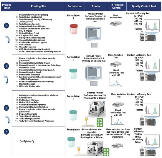 The development of the project unfolded through four phases, each designed to enhance and refine the introduced automated dosing technology for pharmacy tailored manufacturing of dosage forms. In each phase, the participants used the technology to dose several different tablets with different weights following a strict study protocol. At each participating site, the same study protocol was followed, which is explained more in detail below and graphically in Figure 2.