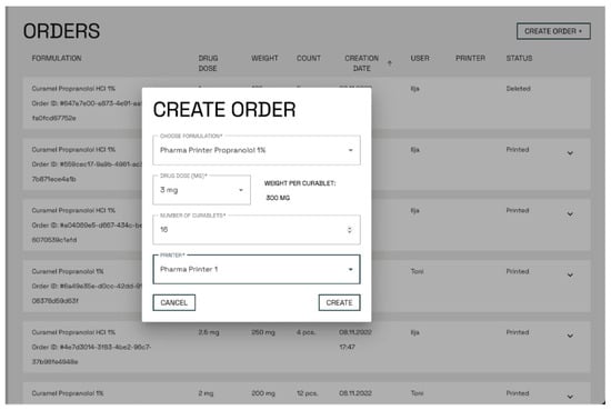 The Pharma Printer (CurifyLabs, Finland) was developed based on user feedback and in-use experiences from the earlier alpha test phases with the NM printer. The Pharma Printer was integrated with an analytical balance (Kern PES-620-3M, Balingen, Germany) and the new CurifyLabs Control Software 2.0. Orders were created from Pharma Kit Software 2.0, where the customers chose the formulation blueprint, dose, tablet amount, and device to be used and then executed the order (Figure 3) Correct dosing parameters were tested and validated by CurifyLabs into a blueprint, which was integrated into the software. The Software creates a unique print order ID code for each order. Once the order was created, the dosing process was controlled from the printer screen, where the CurifyLabs Control Software 2.0 guided the user through the dosing process.