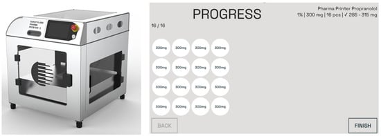 To prepare the formulation, a warm propranolol 1% formulation was poured into a single-use syringe; excess air was pushed out, the nozzle was closed with a cap, and the syringe was placed into the Pharma Printer for preheating. The heating time was 15 min, or it could be left out if the formulation was dosed earlier and was at the correct deposition temperature or preheated. Tablets were deposited directly into the blister on top of the analytical balance, and the analytical balance automatically measured and recorded each tablet’s weight twice. This update in the weighing process ensured that no extra material ended up in the tablet after the ink extrusion. The weight of each tablet was shown on the printer screen with the printing order information (Figure 4). The software used a deviation limit of ±5% for tablets over 250 mg and ±7.5% for under 250 mg according to Ph. Eur. uniformity of mass of single-dose preparations and indicated in red if any tablets did not comply with the Ph. Eur. specifications. Tablets in the blister were sealed with the blister lid.