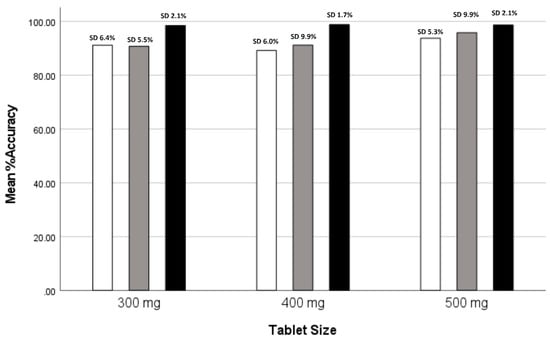 To calculate dosing accuracy, the number of tablets within specification based on mass variation criteria was divided by the total number of tablets, and then multiplied by 100 to express the result as a percentage.
