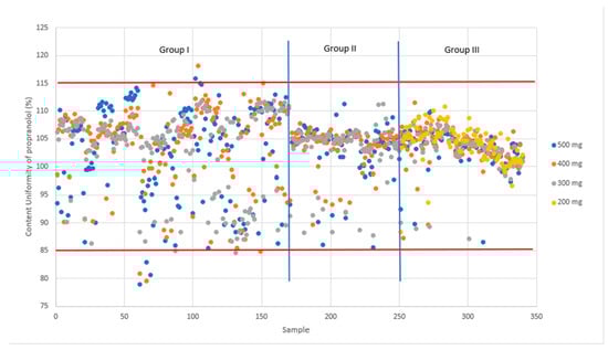 However, it is important to note that some values slightly exceed the upper limit of 110%. This may be attributed to inadequate mixing during the mixing process, resulting in localized areas with higher concentrations of the active ingredient. While these outliers are minimal, they underscore the significance of thorough blending to ensure homogeneity across the entire batch. Furthermore, the ongoing improvement in the partial least squares (PLS) model for blend uniformity remains a continuous process. This involves refining the model-building process to enhance its accuracy and predictive capabilities. The CU and AV values form the HPLC analyses confirm the high quality of blend uniformity. It is important to understand that the NIR analysis utilizes a very small sample amount, approximately 25–50 mg of sample.