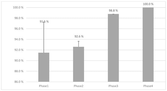 The mean weight accuracy (%) observed across the four phases of this study. In Phase 1, a total of 2448 tablets were used. Phase 2 utilized 1152 tablets, while Phase 3 involved 2112 tablets. Phase 4, which marks the final step, utilized a total of 336 tablets. It is noteworthy that Phases 1 and 2 were conducted using the MiniLab, while Phases 3 and 4 utilized the Pharma Printer extrusion-based dispenser. Remarkably, the figure demonstrates 100% accuracy achieved in the final step, reflecting the efficacy of the implemented improvements.