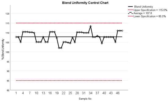 In earlier studies, NIR spectroscopy was used, for instance, for quantitative measurement of accurate dosing of theophylline [21], levothyroxine, and prednisolone using inkjet printing [22]. Recently Seani-Viano et al. [23] reported on a case study of 3D-printed efavirenz tablets and successful real-time NIR measurements of them. Blend uniformity results indicated a mean of 107.8% with a standard deviation of 2.6% (Figure 10). These data fall within the specified range of 90 to 110%, aligning with the internal specification for blend uniformity. Thus, they meet the acceptance criteria for content uniformity, which typically ranges from 85% to 115%.