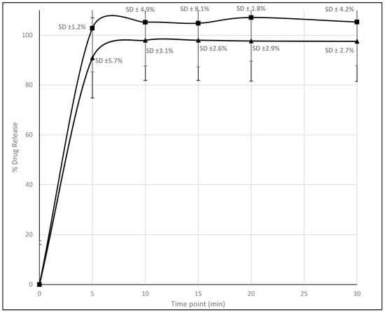The Figure 11 illustrates that both formulations primarily release the majority of the drug within the initial 5 min. However, Formulation II demonstrates a slightly higher drug release, surpassing 100%, potentially attributed to overestimation or experimental error, as indicated by fluctuations above 100%. Conversely, Formulation I exhibits a release that maintains at approximately 98% from the 5 min mark onwards. The presence of polysorbate in Formulation II likely contributes to the slightly improved dissolution characteristics, resulting in a sharper drug release profile initially. This observation suggests that the addition of polysorbate has the potential to enhance the dissolution behavior of the formulation, as reported regarding the ability of polysorbate to enhance solubility and dissolution rates of poorly water-soluble drugs [24].