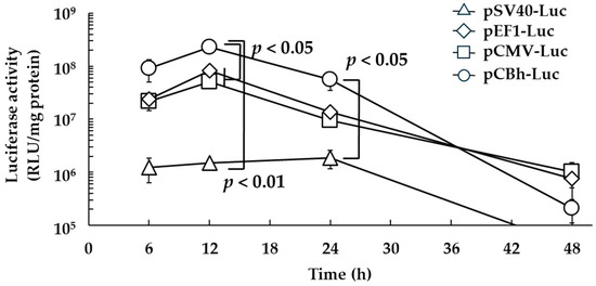 The luciferase activity, as an indicator of in vitro time-dependent transfection activity, was significantly higher for the pCBh-Luc complex pDNA ternary complex than for the other pDNA ternary complexes at 12 h post-treatment (Figure 2). In addition, the luciferase activity was significantly higher for the pCBh-Luc complex than for the pSV40-Luc complex at 24 h after administration. At 48 h post-treatment, the luciferase activity decreased to approximately 1% of the peak for all pDNA ternary complexes, and there was no remarkable difference in silencing.