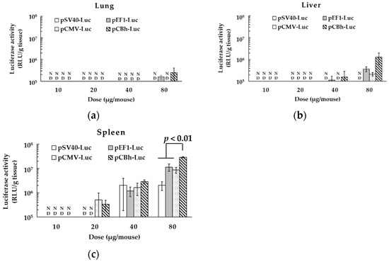 In a preliminary experiment, all pDNA ternary complexes containing 80 μg of pDNA showed luciferase activity below 1 × 105 RLU/g tissue, which is a measurable limit in the kidney and heart after intravenous administration. Therefore, we determined the in vivo gene expression in the lung, liver, and spleen. In these organs, the transfection activity of each pDNA ternary complex increased dose dependently, and the spleen showed the highest gene expression among the tested tissues (Figure 3). In particular, the transfection activity in the spleen was significantly higher for the pCBh-Luc complex than for the other pDNA ternary complexes at a dose of 80 μg. However, in the liver and lung, there were no significant differences between these pDNA ternary complexes at all doses.