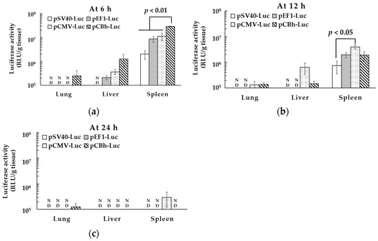Promoter activity sometimes differs between in vitro and in vivo conditions [34], and the pDNA ternary complex could be taken not only by DCs but also other types of cells in the spleen, lung, and liver after intravenous administration. Therefore, we administered pDNA ternary complexes intravenously and examined the transfection activity of each pDNA ternary complex in the lung, liver, and spleen. According to our previous report, the pDNA ternary complex led to high gene expression in the spleen [8]. In particular, the pCBh-Luc complex showed the highest transfection activity in the spleen 6 h after intravenous administration (Figure 3 and Figure 4). At 12 h post-transfection, luciferase activity was higher for the pCMV-Luc complex than for the pSV40-Luc complex. There was no significant difference in luciferase activity between the pCMV-Luc complex and pCBh-Luc or pEF1-Luc complex at 12 h. In all pDNA ternary complexes, the luciferase activity was almost undetected 24 h after administration.