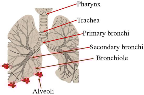 The lung is an attractive target for drug delivery due to its large surface area, which is about 75–140 m2, and a relatively low enzymatic controlled environment for systemic absorption of medications [1]. The lungs, located in the thoracic cavity, consist of major structures, such as bronchi, bronchioles, alveoli, and blood vessels (Figure 1). The airway passages serve to transport air in and out of the lungs while exchanging both O2 and CO2 with the bloodstream, which is the main responsibility of the alveoli. Additionally, understanding their anatomy is vital in comprehending respiratory functions, diseases, and treatments [2,3].
