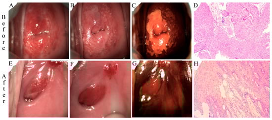 Colposcopic and histological examinations before (top panel) and after PDT (bottom panel). (A,E) Gross view, (B,F) after acetic acid test, (C,G) after iodine staining, and (D) H&E stain (100×) and (H) H&E stain (10×).