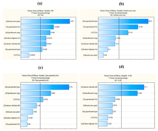 Pareto charts of the effect of the examined independent variables on the outcomes (PDI, particle size, zeta potential, and % EE) of dry powders (a–d). Bars that exceed the vertical line indicate that the terms are significant (p ˂ 0.05).