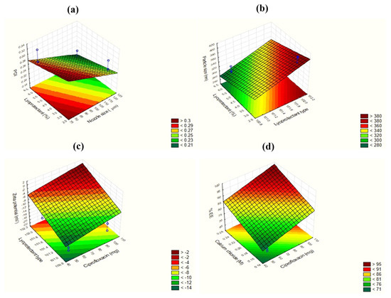 Surface plots obtained by STATISTICA® 12 software presenting the relation between the most influential independent variables on the outcomes (PDI, particle size, zeta potential, and % EE) of dry powders (a–d).