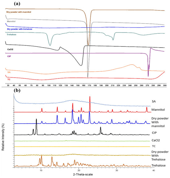 The DSC curves present the thermal behavior of the excipients, drug, and dry powders. As can be seen in Figure 4a, CIP displays a sharp endotherm at 272.58 °C [31], which is the melting peak; however, it is absent in the dry powder samples presenting the encapsulation of the drug within the particles in amorphous form. The lyoprotectant, mannitol, demonstrated a melting endotherm at 170.11 °C, which was also present in the dry powder mannitol sample, showing its recrystallization behavior during the cooling of the samples [32]. Trehalose dihydrate thermograms present the order-to-disorder phase transition with the first endotherm at 100.12 °C, corresponding to the dehydration/loss of unbound water. Furthermore, another endotherm at 212.03 °C displays the fusion of anhydrous β form of trehalose [33]. However, these peaks were absent in the dry samples with trehalose, showing the amorphous nature of trehalose upon drying. CaCl2, which was used as a cross-linker, presented a melting peak at 156 °C [34], which was, however, not present in the dry powder samples, showing the stability of the excipient after drying. TC and SA did not exhibit any sharp peaks individually or in the dry samples.