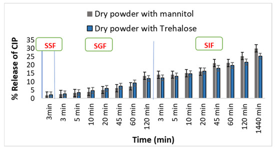 The in vitro dissolution studies were carried out in three phases: oral, gastric, and intestinal. For this purpose, electrolyte solutions mimicking the gastrointestinal tract fluids were used. The composition of these electrolytes’ solutions has been mentioned in the Supplementary File. The protocol used has already been described by Minekus et al. [21], and it was modified slightly for the study [22]. The study was carried out for 24 h at 37 °C with continuous stirring. Dry powder equivalent to 25 mg of CIP was added to 4 mL of simulated salivary fluid (SSF) and 25 µL of CaCl2(H2O)2. The pH of the media was modified to 7, followed by the addition of water to bring the volume up to 10 mL. After 3 min, 2 mL of the sample was withdrawn, filtered, and quantified for drug content spectrophotometrically. The withdrawn volume of the sample was replenished with fresh SSF medium. Later, the medium was changed to gastric conditions by adding 8 mL of simulated gastric fluid (SGF) and 5 µL of CaCl2(H2O)2, and 1 M HCl was added dropwise to adjust the pH to 3 to mimic the acidic environment of the stomach, and the volume was adjusted to 20 mL with water. The samples were withdrawn at predetermined time intervals, and the medium was replaced each time to maintain the sink conditions. After 2 h, the medium was modified to mimic the intestinal conditions by adding 16 mL of simulated intestinal fluid (SIF) and 40 µL of CaCl2(H2O)2, followed by maintaining a pH of 7. The final volume was adjusted to 40 mL. The samples were withdrawn at specified time intervals, and the missing volume was replenished with fresh SIF medium. This intestinal phase study was conducted for 24 h.