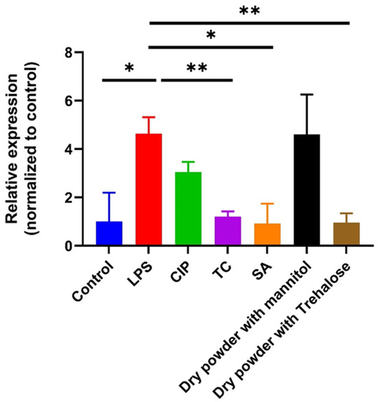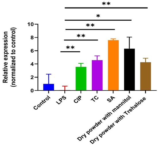 After propagation in Eagle MEM medium, the Caco-2 cells were transferred to 6-well plates at a density of 1 × 106 cells/well. Each sample was used in triplicate. Except for the cell control, 5 µg/mL LPS (Thermo Scientific, Waltham, MA, USA) was added to 30 µg/mL CIP, TC, SA, dry powder with mannitol, and dry powder. Untreated cells served as negative control; LPS-treated cells served as positive control. The plates were then incubated for 24 h at 37 °C in a CO2 incubator. The following day, supernatant was aspirated from each well, and the samples were washed with PBS. Subsequently, 1 mL of TRI reagent was added to each well and incubated for 5 min at 4 °C. Finally, the TRI reagent seeded suspension was transferred to 2 mL microcentrifuge tubes and stored at −80 °C until RNA purification.