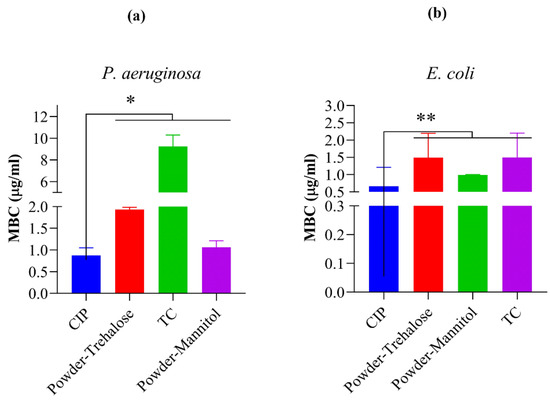 P. aeruginosa and E. coli were used for the antibacterial assay to determine MBC. P. aeruginosa is a Gram-positive bacterium responsible for urinary tract and respiratory diseases, whereas E. coli is a Gram-negative anaerobic bacterium that causes stomach infections. As our research was aimed at targeting gastrointestinal ailments using oral delivery, these bacteria models were found to be relevant to the work. The MBC study was carried out for the nascent drug, dry powders, and TC (Figure 9). As TC is mentioned to have some antibacterial properties, this fact was also explored. The MBC values for the dry powder samples with mannitol were found to be lower, i.e., 1.06 µg/mL and 0.99 µg/mL for P. aeruginosa and E. coli, respectively, compared to the dry powder samples with trehalose (1.93 µg/mL for P. aeruginosa and 1.49 µg/mL for E. coli). Moreover, the polymer TC also exhibited bactericidal activity with high MBC in the case of P. aeruginosa, i.e., 9.25 µg/mL, but in the case of E. coli, MBC was found to be 1.49 µg/mL. Altogether, the results were quite promising, as the powder samples exhibited an MBC almost similar to that of CIP.