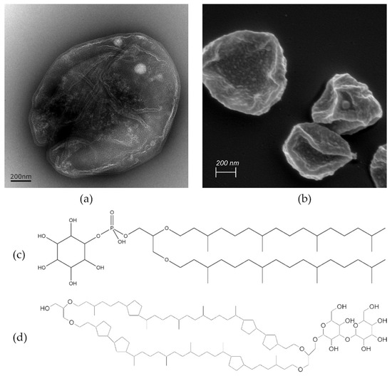 Archaea are a group of single-celled prokaryotic microorganisms. In the phylogenetic tree, they represent—besides bacteria and eukaryotes—the third domain of life. Concerning their ancient evolutionary history, archaea can typically withstand extreme conditions such as high temperatures, acidic pH values, elevated pressure, or high salinity [1]. For example, Sulfolobus acidocaldarius, one representative of the thermophilic subgroup of archaea commonly occurring near hydrothermal sources, can endure temperatures as high as 80 °C and acidic pH values as low as 2 [2]. Figure 1a,b show representative transmission electron microscopic (TEM) and scanning electron microscopic (SEM) micrographs of Sulfolobus acidocaldarius cells, which were used for the isolation of archaeal lipids applied in this study. The exceptional resistance of archaea against high temperatures and acidic conditions stems from their unique plasma membrane composition, characterized by two main components: diether lipids (DELs) and tetraether lipids (TELs) [3,4]. As their names imply, these lipids contain ether bonds connecting prevalent isoprenoid sidechains to glycerol. This is in contrast to ester bonds in phospholipids and amide bonds found in sphingolipids connecting non-branched fatty acid chains to glycerol in bacterial and eukaryotic membranes. The structures of the most prominent ether lipids extracted from cultivated Sulfolobus acidocaldarius are shown in Figure 1c,d.