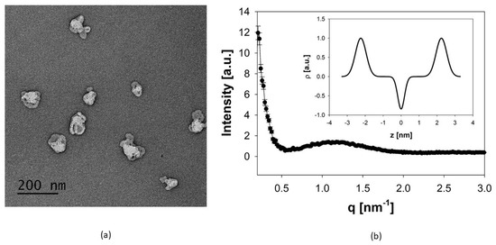 (a) TEM image of negatively stained archaeosomes using 1% uranyl acetate. The image of the air-dried archaeosomes shows single particles with fairly uniform size distribution. The scale bar represents 200 nm. (b) Global fit of the SAXS pattern of archaeosomes indicating unilamellar structures. The inset gives the corresponding electron density profile, in which the distance between the two maxima of the Gaussian modeling of the electron dense headgroup regions gives a measure for the lipid layer thickness.
