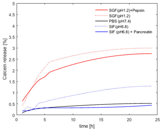 Stability, leakage, and in vitro release kinetics were probed using calcein as a model drug. The calcein molecules were incorporated into the archaeosomes directly during the manufacturing process. Calcein loading induced a noticeable modification of the particle size distribution, resulting in larger but highly uniformly sized particles with a very low PDI value (Table 1). One possible explanation for this effect could be the high calcein concentration, which increases the ionic strength of the solution, potentially enhancing the electrostatic repulsion between the single particles or even changing the curvature of the lipid bilayer. Notably, the particle size and homogeneity remained unchanged after dialysis and removal of the organic solvent and non-encapsulated calcein. To study the permeability of the lipid membrane and particle stability in different media, we monitored the fluorescence signal intensity of calcein. At the initial relatively high concentration of calcein encapsulated within the archaeosomes, the intrinsic fluorescent signal of calcein is self-quenched and the fluorescence intensity is low. Upon leakage and release of calcein from the archaeosomes to the surrounding aqueous environment, the fluorophore becomes diluted and the fluorescence intensity increases in a concentration-dependent manner. This behavior allowed us to follow the release profile of calcein under different environmental conditions. In particular, we investigated the release properties of archaeosomes in PBS buffer (pH 7.4), simulated intestinal fluid (SIF) (pH 6.8), and simulated gastric fluid (SGF) (pH 1.2), with and without the addition of the characteristic digestive enzymes pancreatin and pepsin, respectively. A modified protocol for the in vitro digestion of food in the gastric and intestinal phase, which recommends an incubation for 2 h at 37 °C, was applied [38]. As we did not see any release after 2 h, we repeated the whole experiment for 24 h but this time at 20 °C to follow particle stability over time rather than digestion. This approach allowed us to better understand the behavior of archaeosomes under different conditions and time scales. Across all samples, a minor release was observed within the first few hours, which was minimal for samples incubated at pH 7.4 in buffer and at pH 6.8 in SIF, regardless of the presence of pancreatin. At pH 1.2 the overall release rate was slightly higher but still remained below 3%, irrespective of the presence of pepsin. After a certain time, the release curves flattened out, indicating no further release of calcein from the particles (Figure 3). The very low release rate observed over 24 h demonstrated the high stability of the archaeosomes, even when exposed to extreme pH conditions. Just after chemical destruction of the lipid membrane with solubilizing detergents (addition of 10 µL, 10% Triton X-100) an immediate and rapid release of the payload could be induced, considered as 100% release. For oral drug delivery the elevated stability implies that the particles readily survive the harsh conditions of the stomach (simulated by SGF), however, the particles are equally stable in the intestinal environment (simulated by SIF). Additionally, degrading enzymes had no marked impact on the membrane stability of the archaeosomes as observed in vitro using a commercially available porcine pancreatin extract. This extract is commonly used and contains a mixture of proteases, amylases, and lipases with well-characterized enzyme activities. However, the phospholipase activity in the porcine pancreatin extract is four times lower than that found in human pancreatic juices, where degradation is more likely to occur [39]. Nevertheless, our data support the general consensus that archaeosomes are less susceptible to enzymatic digestion by lipases when compared to conventional liposomes composed of ester lipids [12,40].