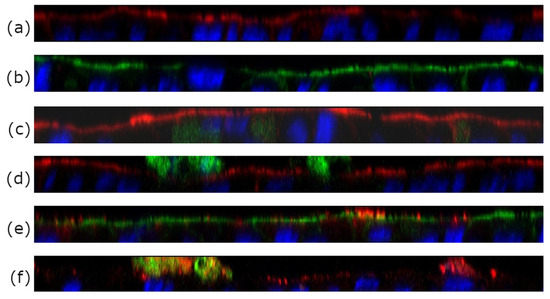 CLSM z-scans of co-culture (Caco-2/HT_29MTX of 7/3) cell layers incubated with different archaeosome formulations. (a,b) Blank samples incubated with pure buffer only. The cytoskeleton was labeled with phalloidin (either red or green), the nuclei were stained with Hoechst Blue. (c) Free calcein. (d) Calcein-loaded archaeosomes. The green stain detected on top of the red cytoskeleton layer implies that the calcein is found outside on top of the cell membrane with low penetration of calcein into the cell layer. (e) Co-localization (yellow) of red-labeled empty archaeosomes and the cell layer (in this case colored with a green phalloidin dye) indicates good adhesion of archaeosomes to the cell membrane. (f) shows the co-localization in yellow of calcein (green) still encapsulated within archaeosomes (red). In this case the cytoskeleton was not stained.
