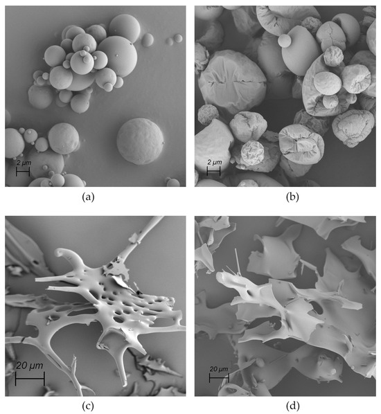 SEM images of dried powders. (a) Spray-dried empty archaeosomes. (b) Spray-dried archaeosomes loaded with insulin. (c) Lyophilized empty archaeosomes. (d) Lyophilized archaeosomes loaded with insulin.
