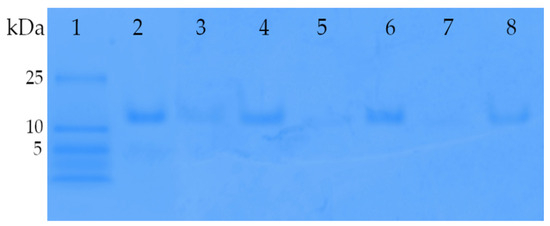 Acrylamide gradient native gel (4–12%) of insulin-loaded archaeosomes. Lane 1 presents the low-molecular-weight marker panel. Lane 2, reference insulin (1 µg) used for the encapsulation process. Lane 3, archaeosome formulation with encapsulated insulin directly after the preparation using microfluidics. The majority of insulin is encapsulated within the archaeosomes, resulting in minimal Coomassie blue staining. Only a faint band is visible due to a portion of non-encapsulated insulin. Lane 4 shows the same formulation mixed with Triton X-100, which disrupts the archaeosomes, leading to the release of encapsulated insulin. Thus, lane 4 corresponds to the amount of initially encapsulated insulin. Lanes 5 and 7 contain insulin-loaded archaeosomes after spray-drying and lyophilization processes, respectively. The powdered formulations were dissolved in water and loaded onto gel. The absence of insulin bands in lanes 5 and 7 suggests negligible insulin release during the drying processes. Lanes 6 and 8 display the same formulations after disruption with Triton X-100, confirming the presence of insulin inside the spray-dried and lyophilized archaeosomes, respectively.