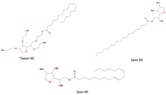 Non-ionic surfactants are often utilized in the formulation of bilosomes due to their superior stability and compatibility as compared to anionic, cationic, and amphoteric surfactants. Non-ionic surfactants are less hemolytic and more conducive in preserving the solution’s pH around its physiological range. These substances serve as solubilizers, wetting agents, emulsifiers, and permeability enhancers [27]. Additionally, non-ionic surfactants serve as potent inhibitors of P-glycoprotein, preventing drug efflux from cells. They facilitate the absorption of drugs and enable targeted delivery to certain tissues. Non-ionic surfactants consist of both polar and non-polar regions, hence exhibiting significant interfacial activity. The entrapment effectiveness of the medication is influenced by the chain length and size of the hydrophilic head groups of non-ionic surfactants. The entrapment efficiency of non-ionic surfactants, namely those containing stearyl (C18) chains, is greater compared to those containing lauryl (C12) chains [28,29]. To achieve the enhanced entrapment efficiency of water-soluble medications, a mixture of Tweens including elongated alkyl chains and substantial hydrophilic components, combined with cholesterol in a 1:1 ratio, can be used [30]. The hydrophilic–lipophilic balance (HLB) value of surfactants is a significant factor in the regulation of drug entrapment inside vesicles. Surfactants with an HLB within the range of 14–17 have been deemed unsuitable for the production of bilosomes vesicles. Conversely, an HLB value of 8.6 has been shown to provide maximum effectiveness in terms of entrapment. The entrapment efficiency decreases when the HLB value decreases from 8.6 to 1.7. The non-ionic surfactants that are often used for the purpose of vesicle production are alkyl esters, alkyl glyceryl ethers and sorbitan fatty acid esters [30]. Non-ionic surfactants which are mainly used in bilosome formulation are shown in Figure 2.